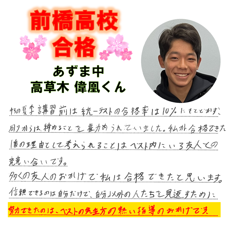 私が合格できた1番の理由として考えられることは、ベスト内にいる友人との競い合いです。多くの友人のおかげで私は合格できたと思います。信頼できるのは自分だけで、自分以外の人たちを見返すために努力できたのは、ベストの先生方の熱い指導のおかげです。