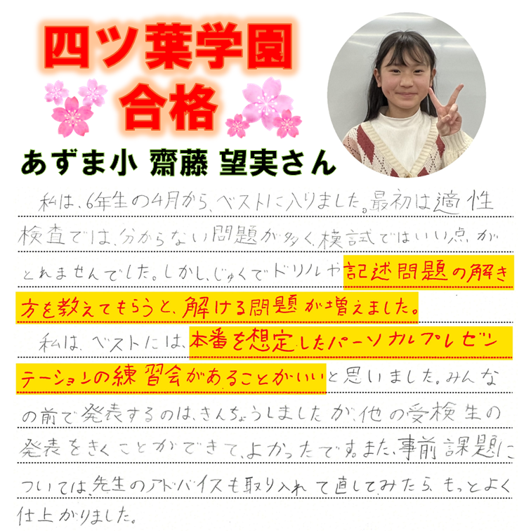 私は6年生の4月から、ベストに入りました。最初は適性検査では、分からない問題が多く、模試ではいい点が取れませんでした。しかし、塾でドリルや記述問題の解き方を教えてもらうと、解ける問題が増えました。